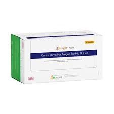 A chromatographic immunoassay for the qualitative detection of Canine Parvovirus antigen in canine feces. This test kit, blot test has a letter "T" and "C" as test line and control line on the surface of the device. Both the test line and control line in the result window are not visible before applying any sample. The control line is used for procedural control. A purple test line will be visible in the result window if there is Parvovirus antigen in the specimen. The specially selected Canine Parvovirus antibodies are used in the test band as both capture and detector materials. These enable the Canine Parvovirus Antigen Test Kit, Blot Test to identify Canine Parvovirus antigens in canine feces with a high degree of accuracy. Test results in 5-10 minutes or less with 100% sensitivity and 100% specificity. No refrigeration required. Kit includes test devices, assay diluent buffer, sample collection swabs, disposable droppers and instructions for use.