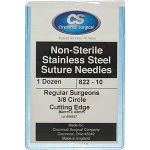 Package Quantity: 12/Pkg Size: #8 Color: Stainless Steel Brand: Cincinnati Surgical Material: Stainless steel Needle Code: 822-8 Overall Length: 50 mm Outside Diameter: 1 mm Product Type: Surgical Needle Reusability: Reusable Needle Circle Size: 3/8 Needle Point: Cutting Edge Needle Shape: Circle Sterile: N