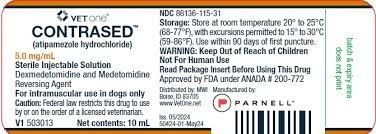Contrased Injectable Solution (atipamezole hydrochloride) is indicated for the reversal of the sedative and analgesic effects of dexmedetomidine hydrochloride, and medetomidine hydrochloride in dogs. See package insert for complete product details.