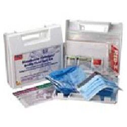 Contents 1 (2) 10 Gallon 24 X 25 Inch Biohazard Bags, (1) Biohazard Scoop, (1) Bodily Fluid Pick-up Guide, (3) BZK Antiseptic Towelettes, (2) Clear Plastic Bags, (3) Disposable Clean-up Towels, (1) Disposable Gown, (2) Disposable Shoe Covers, (1) Eye and Face Shield, (1) 21 Gram Fluid Control Solidifier Pack, (2) 8 X 8 Inch Germicidal Wipes, (2) Nitrile Exam Gloves, (2) Twist Ties