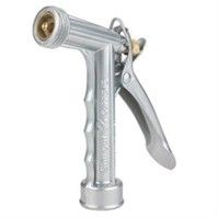 This metallized full size pistol grip nozzle has brass valve stem threaded front permanent adjusting nut and hold-open clip. Stainless Steel Spring and lifetime packing seal.