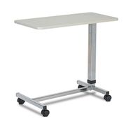 H-Base, Over Bed Table Gray laminate top Chrome plated base Dual wheel nylon casters Single hand, spring loaded height adjustments 50 lbs. load capacity (distributed)