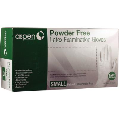 Specifications Package Quantity: 100/Pkg Size: Small Thickness: 5 mil Material: Latex Powdered: N Color: Natural Product Details Aspen Latex PF Exam Gloves.