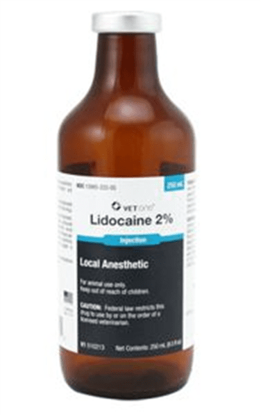 Description: Lidocaine is a potent local anesthetic for producing epidural, nerve conduction and infiltration anesthesia. For use in dogs, cats, cattle and horses. Each mL of sterile aqueous solution contains: • Lidocaine Hydrochloride 2.0% • Propylene Glycol 5.2% • Sodium Chloride 0.5% • Sodium Lactate 0.5% • Methylparaben 0.15%, Sodium Metabisulfite 0.10%, Propylparaben 0.03% and Disodium Edetate 0.001% as preservatives.