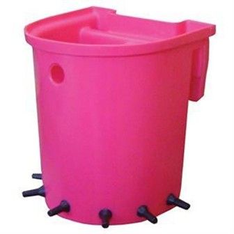 Durable pink poly container hooks onto wire or one-by-four wood rail and the gravity-flow teats require no valves or tubes. Holds about 4 gallons. Wt. 6.5 lbs.