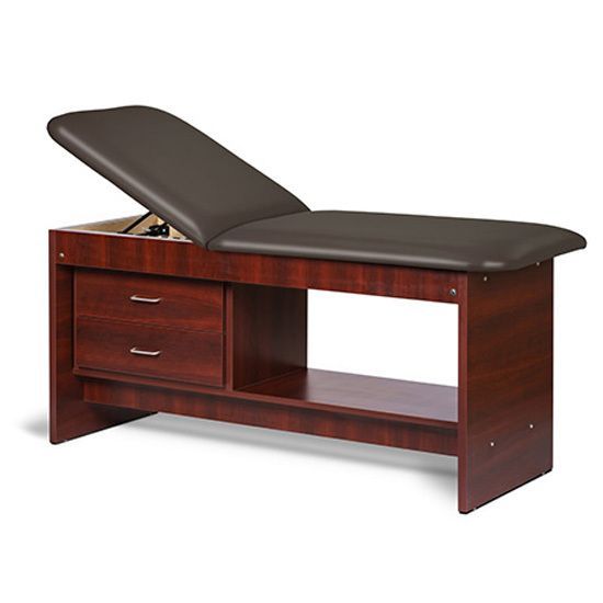 Panel Leg Series, Treatment Table with Shelf and Drawers No upcharge for adjustable backrest All laminate construction Sleek, easy-clean, panel leg design Laminate shelf and two drawers with easy-clean, plastic interiors Adjustable backrest has 6 settings of approximately: 27º, 36º, 43º, 50º, 55º & 60º Scratch resistant topcoat finish Ships flat for easy handling and extra savings Fast and easy assembly Seamless, rounded corner top 2" firm foam padding (5 cm) Heavyweight, knit-backed upholstery 400 lbs. load capacity under normal use (181 kg)