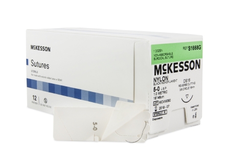 McKesson Synthetic Non-Absorbable Surgical Suture - Nylon Suture 5-0 Suture length: 18" (46 cm) Needle type: DS16, Reverse cutting Suture diameter (mm): 5-0 Suture type: Synthetic, non-absorbable Contains high tensile strength with a uniform smooth surface to permit easy passage through tissue. Resists breakage and retains strength for long periods of time. Material: Black monofilament Sterile Single Use Not Made With Natural Rubber Latex. Packaged: 12 Per Box